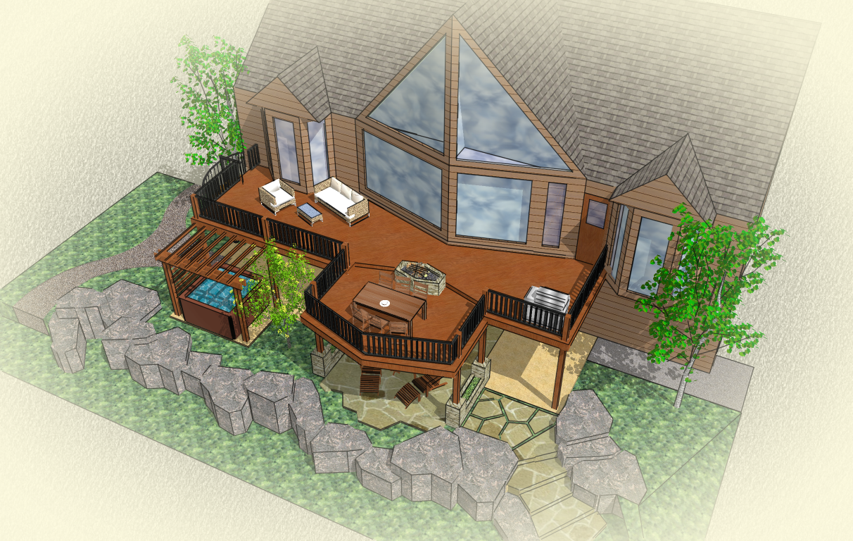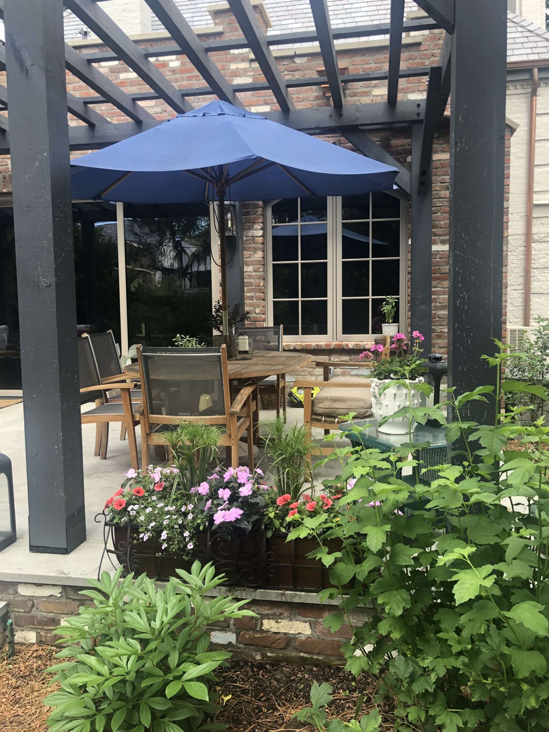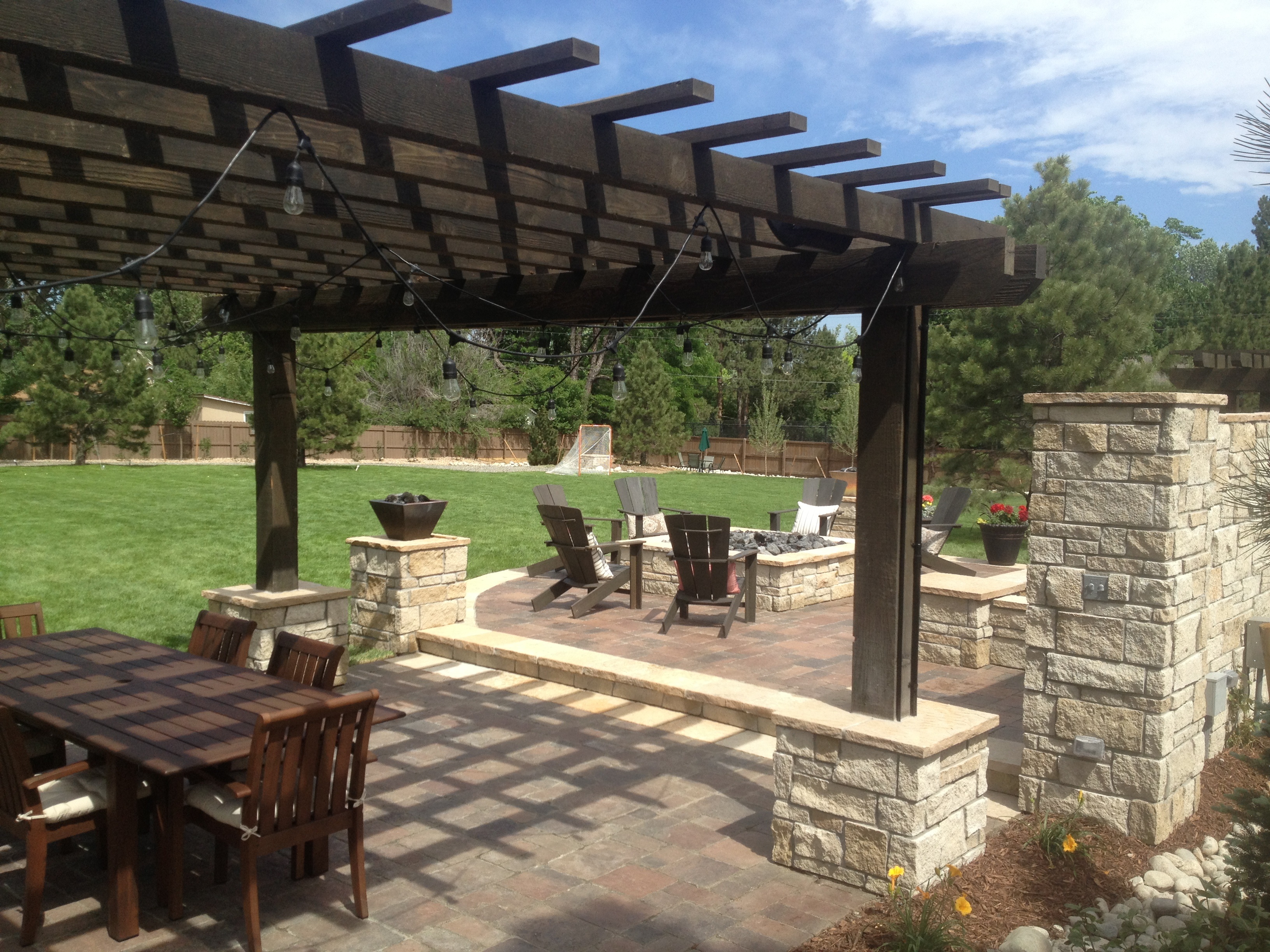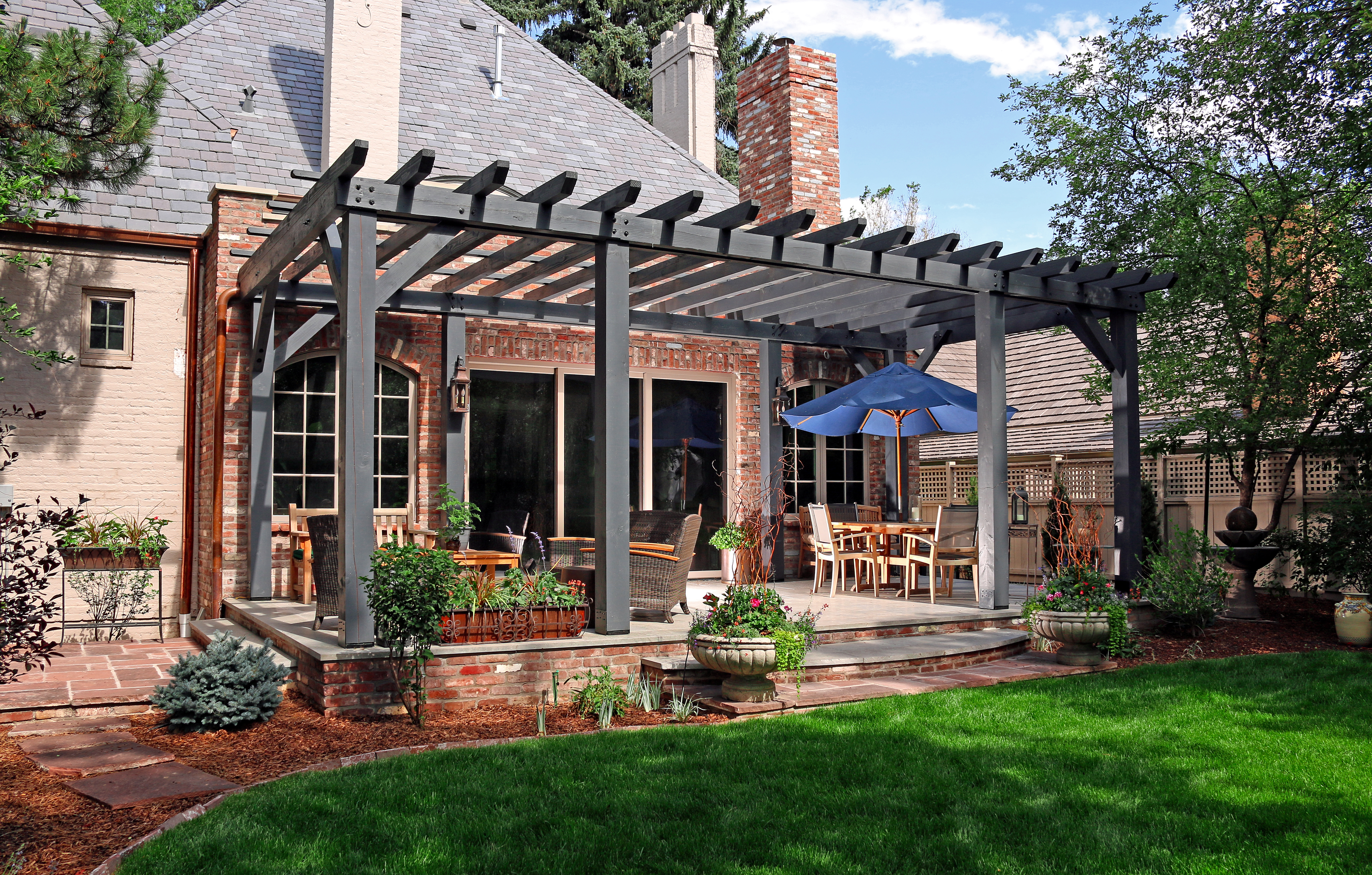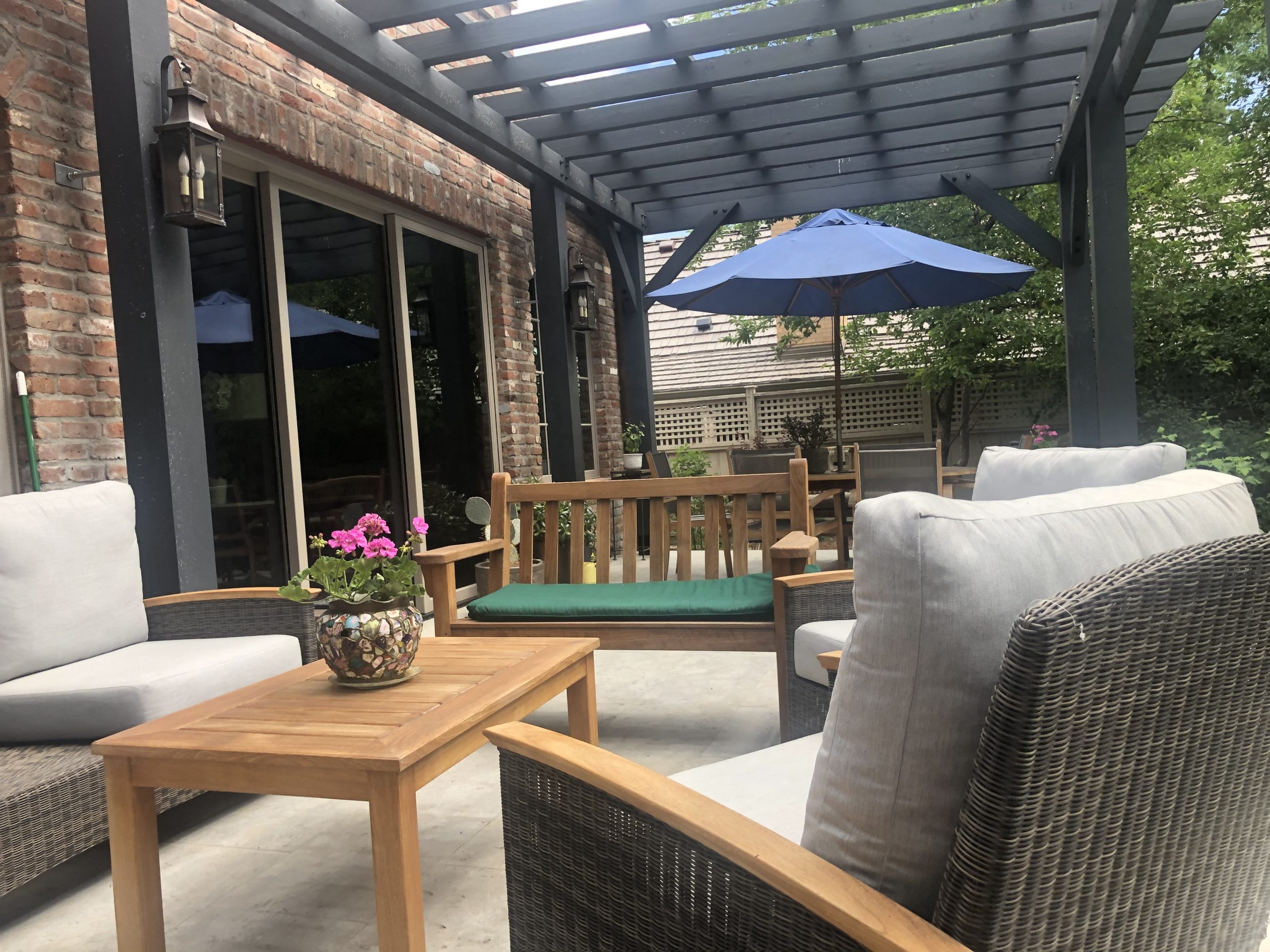 A conversation with the client resulted in creating this compelling outdoor space including a pergola, customized stone patios and landscape that turned this raised patio into a retreat and outdoor entertainment and gathering space.
